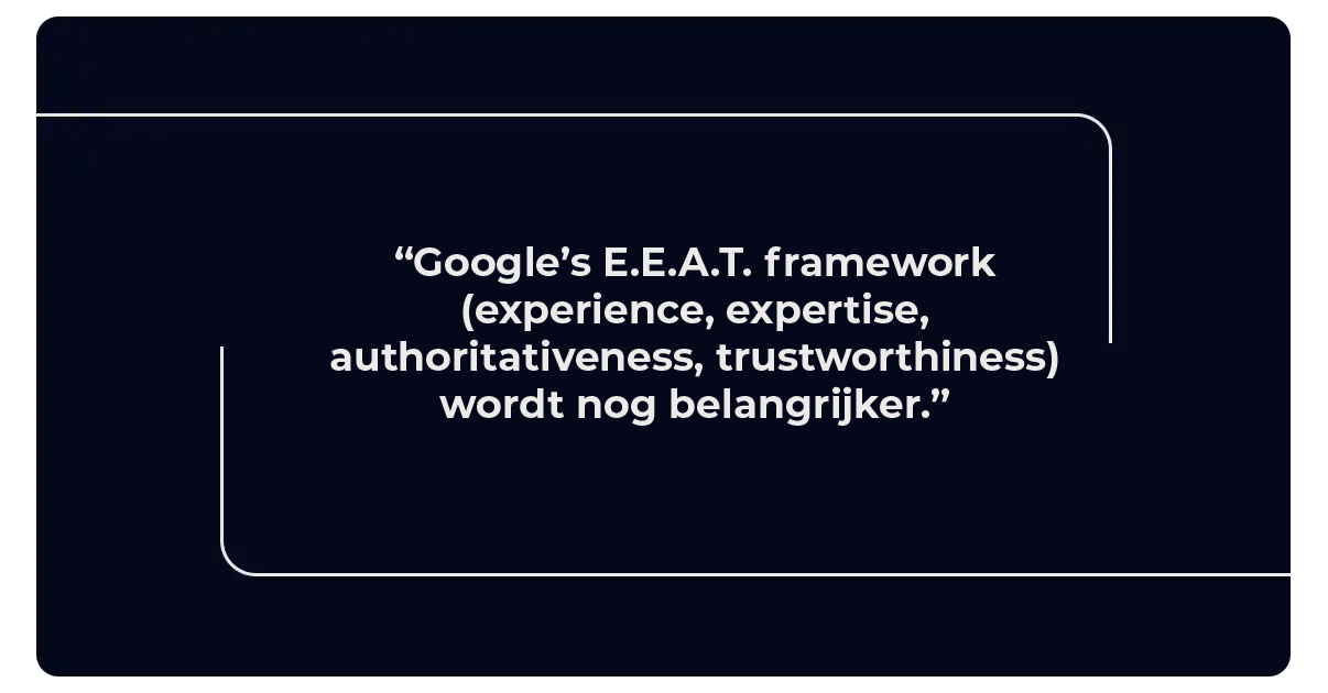 Google’s E.E.A.T. framework (experience, expertise, authoritativeness, trustworthiness) wordt nog belangrijker. AI modellen geven voorrang aan merken die echte ervaring tonen, autoriteit opbouwen en transparant communiceren.